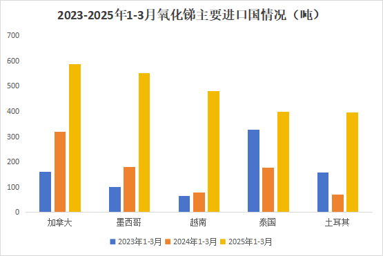 分國別來看,1-3月中國出口氧化銻主要銷往加拿大、墨西哥、越南、泰國、土耳其等國家和地區(qū),分別為加拿大588.0噸,同比上升83.7%;墨西哥551.5噸,同比上升206.4%;越南479.6噸,同比上升510.9%;泰國379.5噸,同比上升124.5%;土耳其397.0噸,同比上升456.8%。