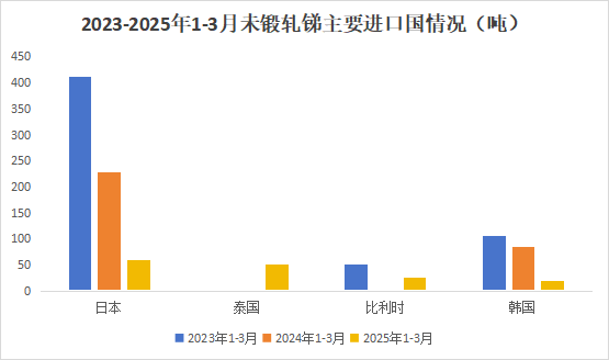 分國別來看,2025年1-3月中國出口未鍛軋銻銷往日本60.0噸,同比下降73.6%;泰國52.0噸,去年同期沒有出口泰國氧化銻;比利時25噸,去年同期沒有出口比利時氧化銻;韓國20噸,同比下降76.5%。