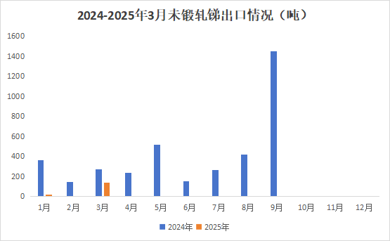 未鍛軋銻出口方面,2025年3月中國未鍛軋銻出口量為137.0噸,2月沒有出口未鍛軋銻,同比下降49.8%;1-3月未鍛軋銻出口量為157.0噸,同比下降80.0%。