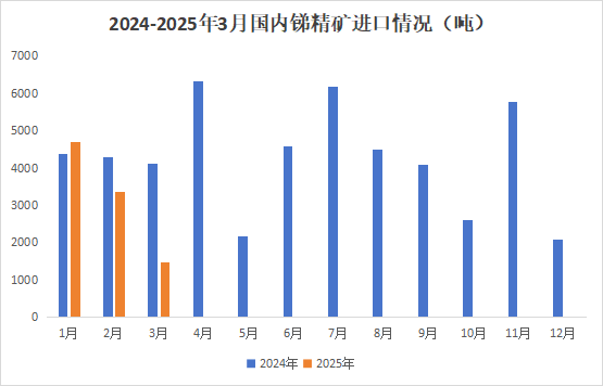 據(jù)海關(guān)統(tǒng)計數(shù)據(jù)顯示,2025年3月中國銻礦砂及精礦進口量為1483.0噸,環(huán)比下降55.8%,同比下降63.9%;1-3月銻礦砂及精礦進口量為9530.2噸,同比下降25.5%。